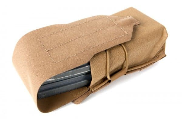 The ULTRAcomp™ high performance laminate backer extends down covering the bottom and coming over the front for increased wear resistance and weight savings. The rest of the pouch is constructed with 500d CORDURA®. The pouch can hold one or two M4 mags held secure and quiet by an elastic band.