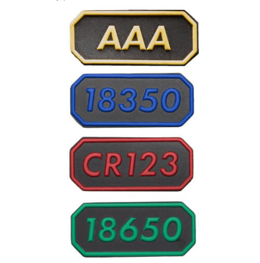 Battery Patches come in sets of three or four. Each has Velcro® backing. They are offered in two color backgrounds: tan and black. The tan set has a lower visual footprint with subdued hues. The black set has vivid colors with each battery name. Each set of three patches includes one of each: CR123 patch, 18650 patch, and 18350 patch. Packs of four patches include a CR123 patch, 18650 patch, 18350 patch, and AAA patch.